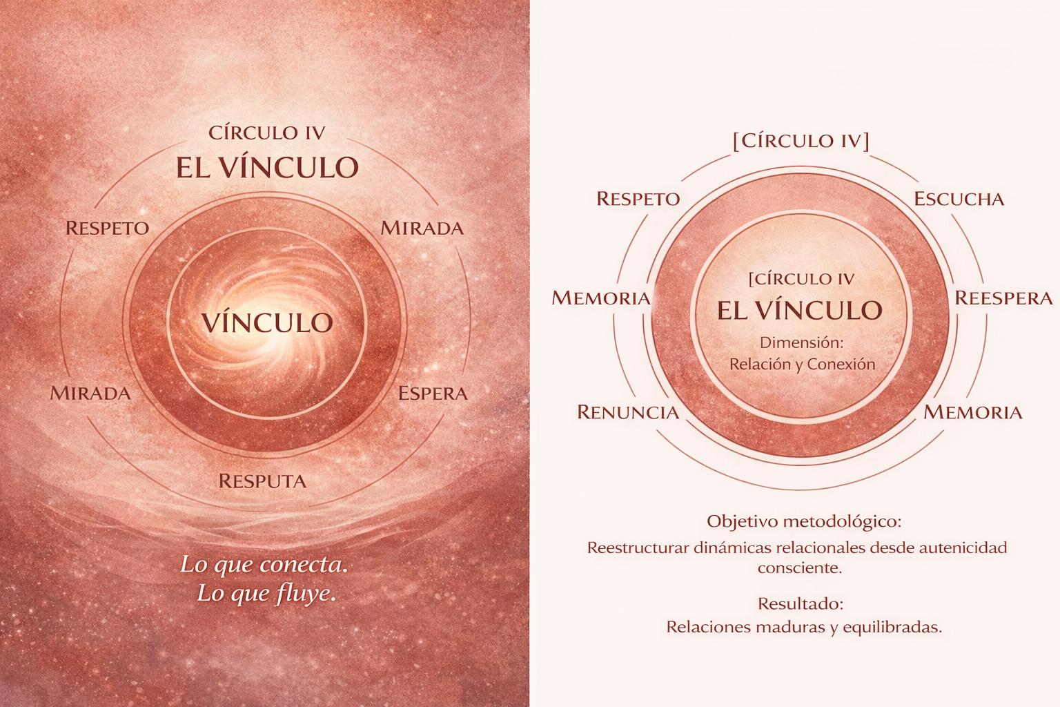 En el Círculo IV de Alavitae, rompemos ese pacto de pequeñez. Aquí, el vínculo no nace de la necesidad, sino de la plenitud. Ya no buscamos afuera lo que ya hemos construido adentro; ahora, permitimos que nuestra verdad cree nuestro entorno.